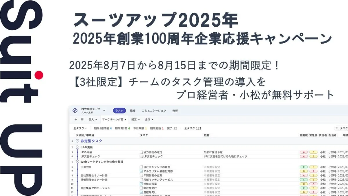 株式会社スーツが提供するチームのタスク管理及びプロジェクト管理ツール「スーツアップ」は、2025年に創業100周年を迎える企業への支援キャンペーンを発表しました。今回はキャンペーンの詳細や「スーツアップ」とは何か、どのように企業の生産性向上に寄与するのかをご紹介します。