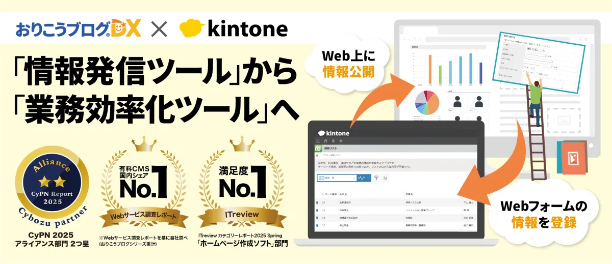 おりこうブログDXは、2万社以上の導入実績を誇るWebサイト作成ツール「おりこうブログ」にkintoneとの連携機能を追加した製品です。このツールを使うことで、Webサイトとkintoneをシームレスに繋げることができ、業務の効率化を強力にサポートします。