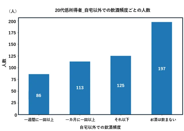 1,022名のアンケート回答をもとに、年収400万円を境に飲酒層を低所得層と中所得層に分け、分散分析を行いました。その結果、飲酒頻度が高い群は、充実感や自己満足といった因子においても有意に高い値を示しました。特に外向性や協調性の差は、飲酒が個々の社交的行動にどのように関連しているかを示すデータです。