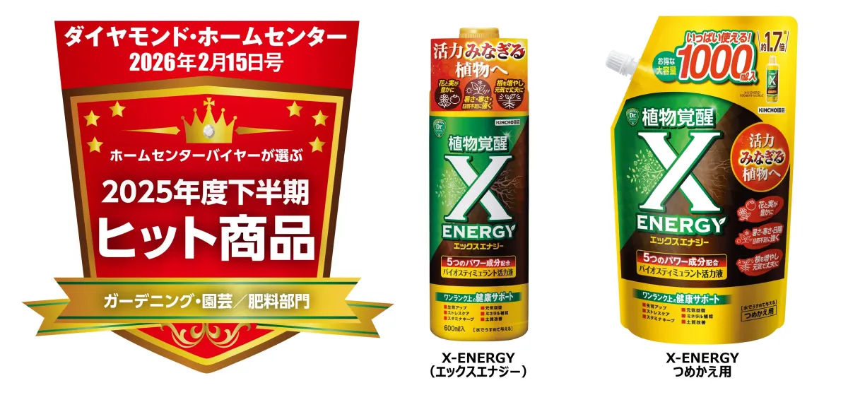 KINCHO園芸株式会社が、新たに開発したバイオスティミュラント活力液「X-ENERGYつめかえ用」が、ダイヤモンド・ホームセンター誌で「ホームセンターバイヤーが選ぶ2025年度下半期ヒット商品」に選出されました。この商品は、植物の生理機能を活性化し、厳しい環境下でも力強く成長する手助けをする画期的な資材です。