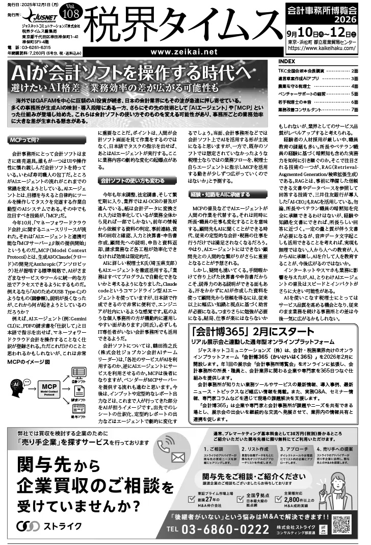 会計業界において、最新号の『税界タイムス』が注目するのは、生成AIやAIエージェントの進化です。特に、業務を自律的に進める能力が求められている昨今、会計ソフトの操作までAIに任せる未来がやってきます。この革新は、特に新技術であるMCP(Model Context Protocol)の導入がカギとなっています。この技術により、会計事務所の業務プロセス全体が劇的に変化しつつあります。