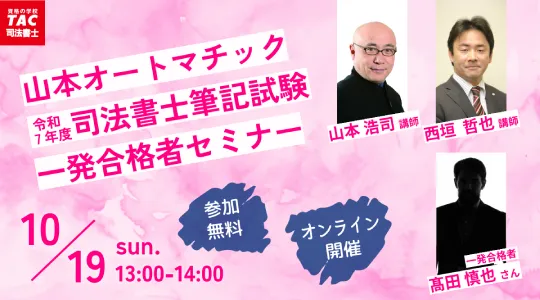 2025年10月19日(日)、TAC司法書士講座が主催する「山本オートマチック 令和7年度司法書士筆記試験一発合格者セミナー」が開催されます。このオンラインセミナーは、司法書士としてのキャリアを考えている方や、合格を目指して学習を始めようとしている初心者の方々にとって有益な情報を得る絶好の機会です。