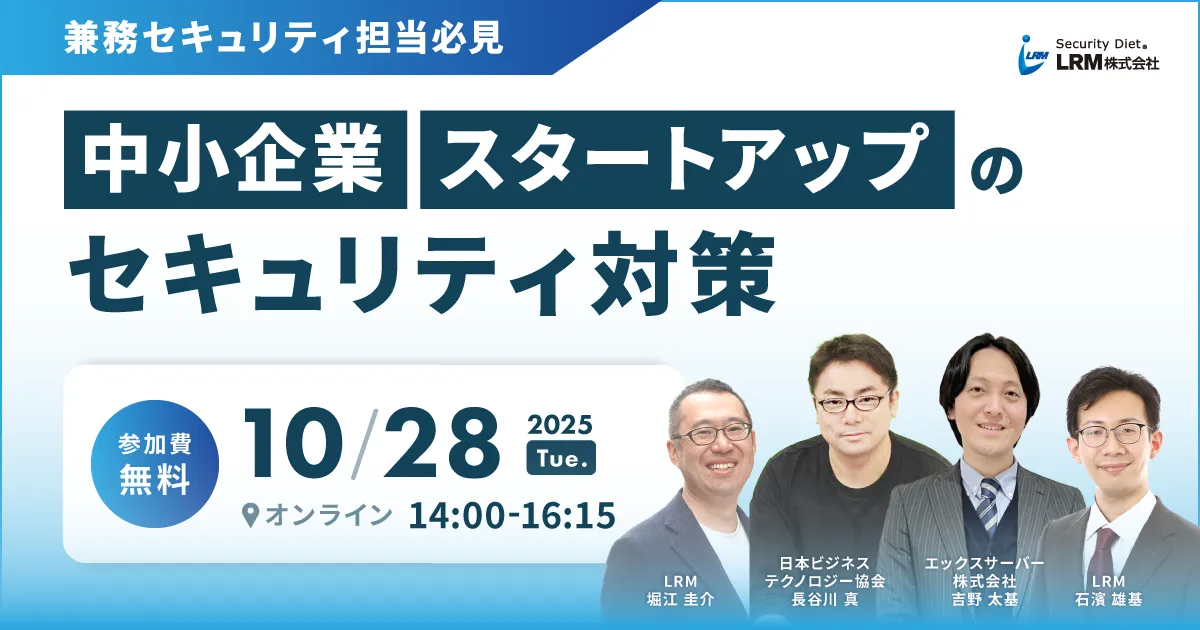 中小企業やスタートアップは、限られたリソースでの運営が常であり、特にサイバーセキュリティに関しては大きな課題に直面しています。そんな中、LRM株式会社では、2025年10月28日(火)14:00から16:15まで、オンライン(Zoom)で「中小企業/スタートアップのセキュリティ対策セミナー」を開催します。本セミナーは無料で参加可能ですので、ぜひお知らせください!