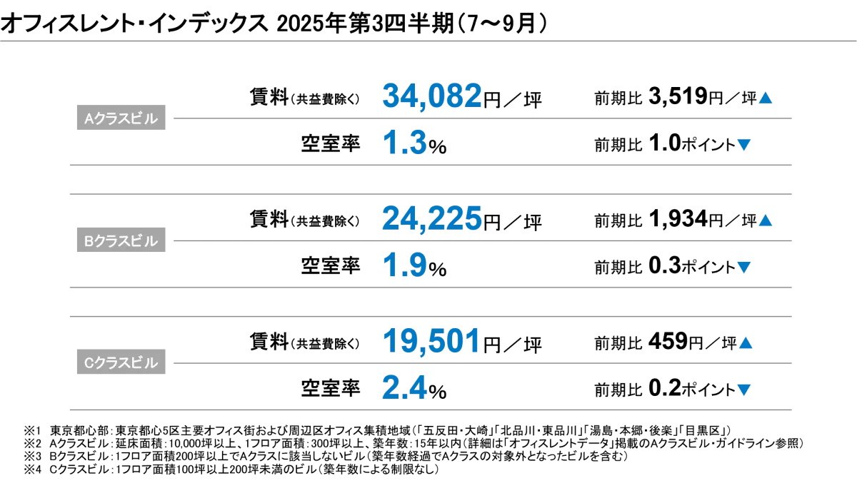 2025年第3四半期のオフィスレント・インデックスが三幸エステートとニッセイ基礎研究所の共同データとして発表されました。この指標は東京都心部のオフィスマーケットを詳細に分析したものです。各クラスビルの賃料や空室率の変動が大きく注目されています。