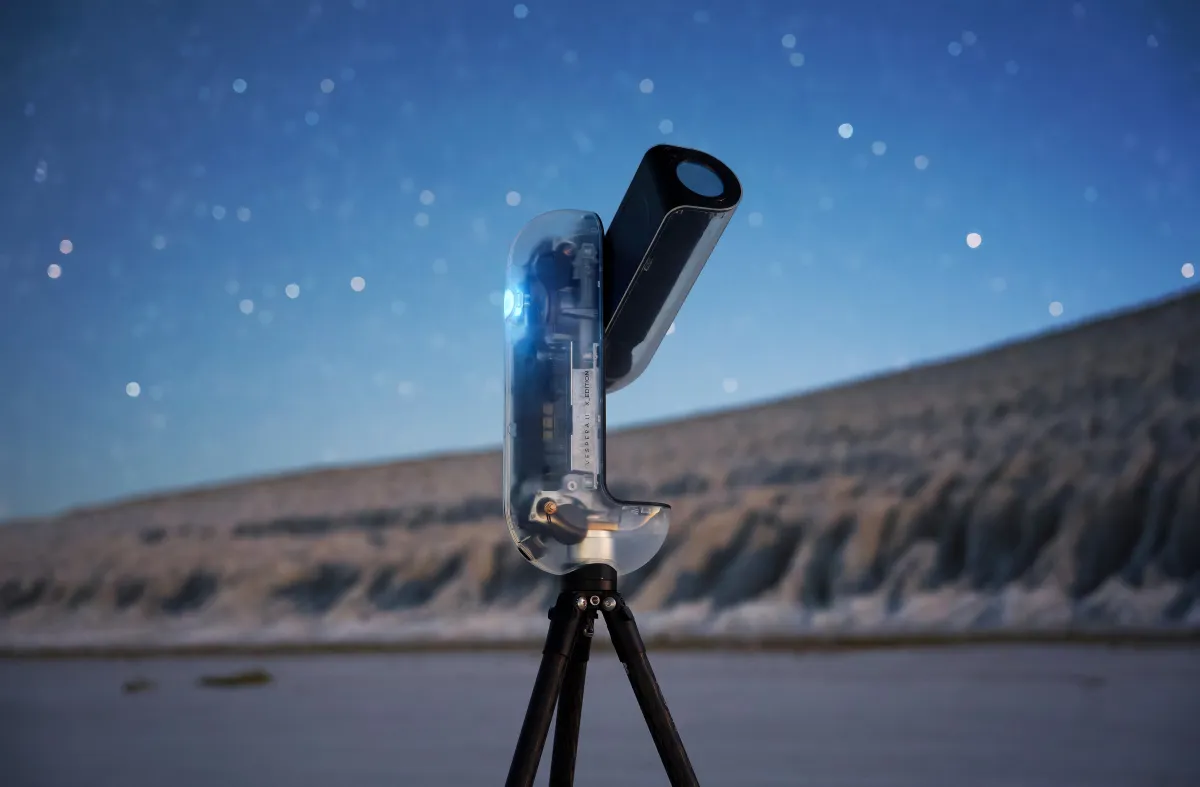Vespera II-X Editionの特徴の一つは、その透明なシェルデザインです。一般的な望遠鏡では味わえない、機能美をそのまま体験できるデザインが施されています。観測中にその内部機構を見ることで、どのように星を捉えるのか、またどのように機器が動作しているのかを直感的に理解することができます。まさに、科学とデザインが融合した最高の製品です。