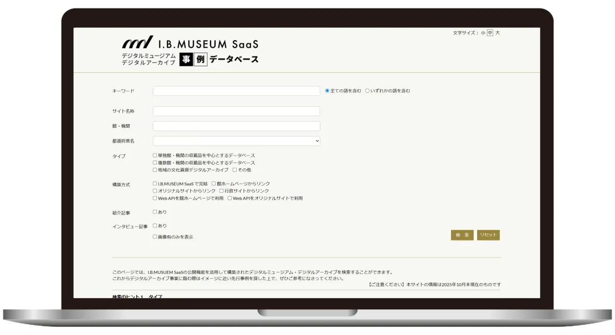 博物館向けクラウドサービス「I.B.MUSEUM SaaS」を利用したデジタルアーカイブの新たな検索サービスが登場しました。このサービスは、すでに構築されたデジタルミュージアムやデジタルアーカイブの検索ができるデータベースです。約400の事例を収録し、いよいよ令和7年11月19日に公開予定です。これにより、多くの博物館や文化機関が過去の事例を参考にして自館のデジタルアーカイブを構築する手助けとなるでしょう。