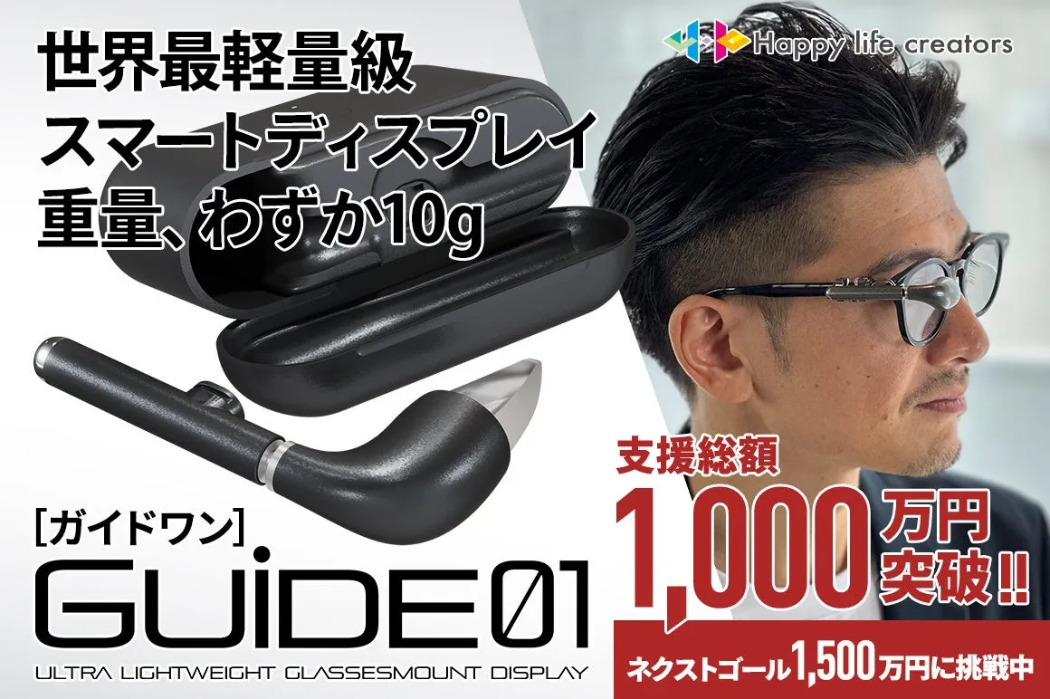 HappyLifeCreators株式会社が開発した世界最軽量のメガネ型スマートディスプレイ「GUIDE01」が、クラウドファンディングの開始からわずか30分で目標金額を達成しました。そして、支援総額が1,000万円を突破するなど、驚異的なスピードで多くの注目を集めています!