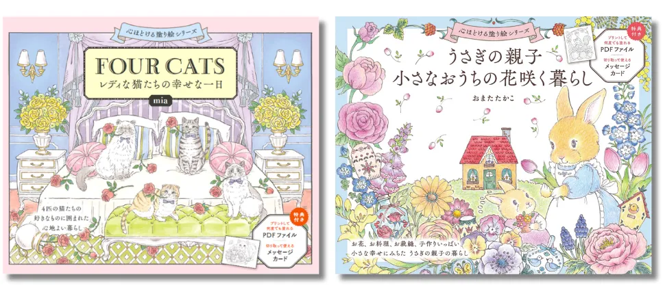 4月23日、世界文化社から新たに「心ほどける塗り絵シリーズ」が発売されます。このシリーズは大人が楽しむことを目的としており、日常生活に癒しをもたらしてくれる塗り絵です。今回の第一弾として、イラストレーターのmiaさんによる『FOUR CATS レディな猫たちの幸せな一日』と、絵本作家のおまたたかこさんによる『うさぎの親子 小さなおうちの花咲く暮らし』の2冊が同時にリリースされます。