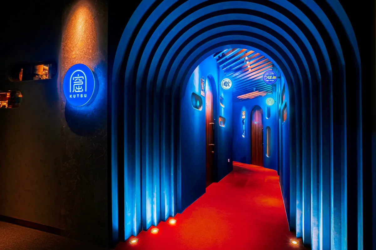 「NEOスナック街 窟」は、従来のキャバレー跡地に誕生した新しいスナック街です。7軒のスナックがカウンター越しでお客様を迎えます。客とスタッフの距離感を縮める設計が施されており、居心地の良さを感じられます。洞窟をイメージした群青色の空間がその神秘的な魅力を引き立てています。