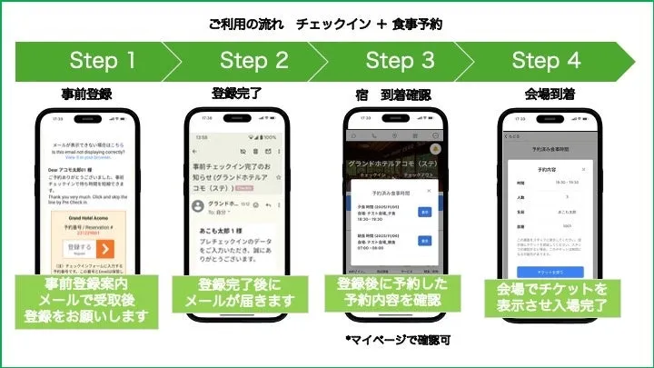 ゲスト向けにも利便性を追求した機能が用意されています。チェックイン時に自動で食事時間選択フォームが表示され、マイページで予約した食事時間を確認することができます。さらに、スマートフォンから直感的に予約や確認が行え、ゲストの利便性が向上しています。