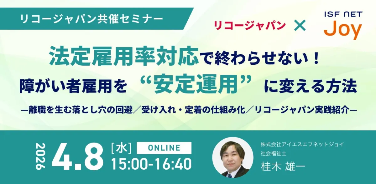 2026年4月8日(水)、株式会社アイエスエフネットジョイとリコージャパン株式会社は共に障がい者雇用をテーマにしたセミナーを開催します。このセミナーは「法定雇用率対応で終わらせない! 障がい者雇用を“安定運用(定着)”に変える方法」を中心に、障がい者雇用の現状やその推進方法について詳しく解説します。