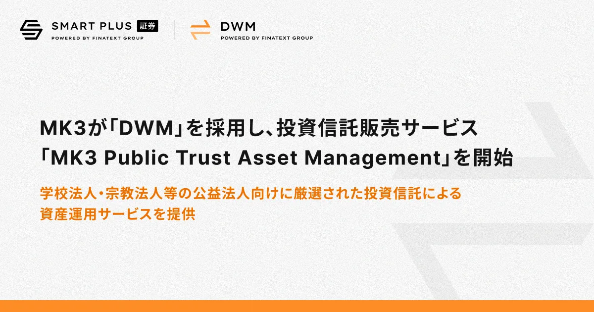今年11月10日(月)、IFA法人MK3が株式会社スマートプラスの証券取引プラットフォーム「Digital Wealth Manager(DWM)」を採用した新サービス「MK3 Public Trust Asset Management」を開始します。このサービスは、特に学校法人や宗教法人などの公益法人を対象にしたもので、長期的視点での安定した資産形成をサポートします。