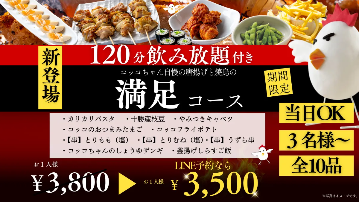 この「満足コース」は3名様から利用が可能で、当日の予約もできますので、急な飲み会や新年会にも最適です。料理内容は、カリカリパスタややみつきキャベツ、十勝産の枝豆といったおつまみから始まり、焼鳥のとりもも、とりむね、うずら串が登場します。また、看板メニューである「コッコちゃんのしょうゆザンギ」や、〆には釜揚げしらすご飯も提供され、まさに満足感たっぷりのラインナップです。