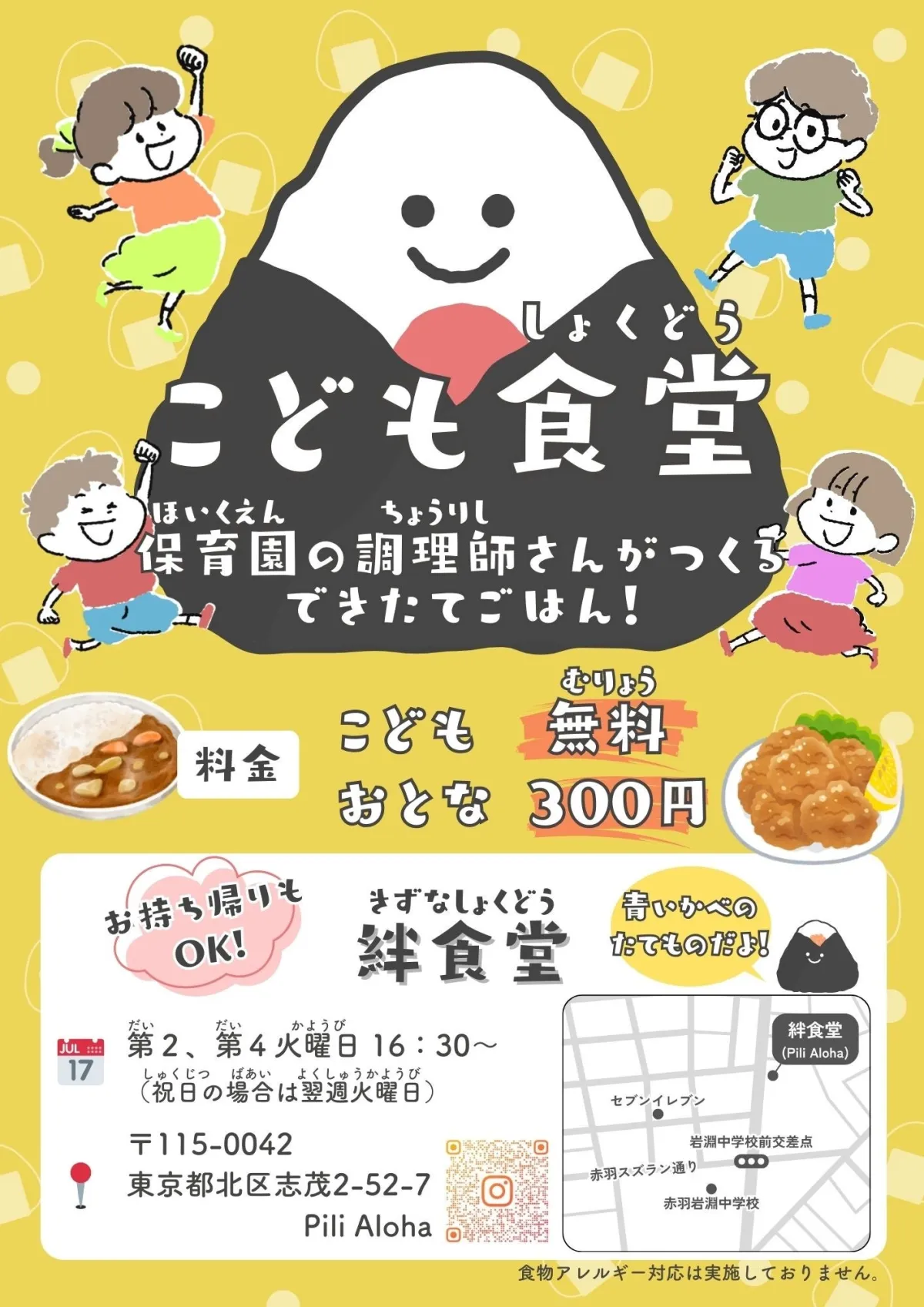 「絆食堂」は、東京都北区志茂2-52-7にあるPiliAloha内で開催されています。16:30からの受付で、各回50食限定での提供です。料金は子どもが無料(高校生まで)で、大人はたったの300円。予約は不要ですので、気軽に訪れることができます。