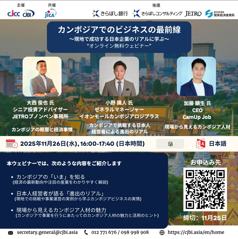11月26日(水)に「カンボジアでのビジネス最前線」と題したウェビナーが開催されます。このオンラインセミナーは、東京を拠点とする株式会社きらぼしコンサルティングが後援し、カンボジアの経済動向を知りたい日本企業の皆様へ今後のビジネスチャンスを提供することを目的としています。特にASEAN地域への進出を検討している企業には必見の内容となっています。