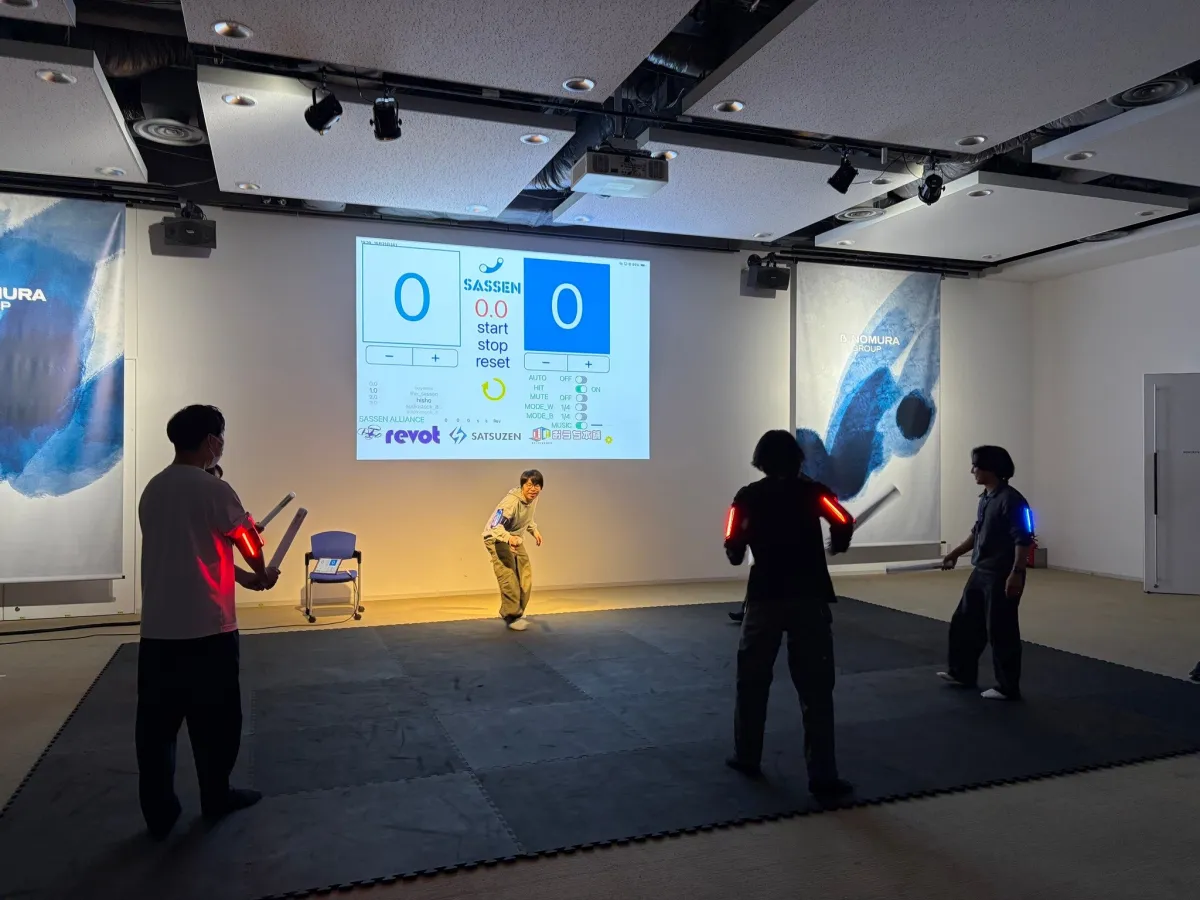 当日は18:00から19:30までの短時間で行われましたが、参加した社員たちは、LEDで光るセンサー刀と自動判定システムによる「SASSEN」の1対1の勝負や、集団戦型の「Cyber KASSEN」の体験を楽しみました。参加者同士のコミュニケーションも活性化され、晴れやかな笑顔が広がっていました。