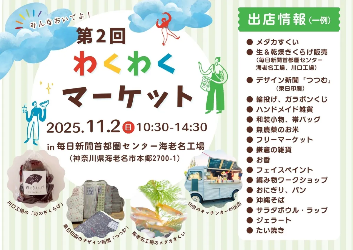 海老名市の毎日新聞首都圏センター海老名工場で、11月2日(日)に「第2回わくわくマーケット」が行われます。このイベントは地域活性化と情報発信を目的としたもので、昨年3月の「第1回わくわくマーケット」が好評を博したことを受けての実施です。今回は、飲食や雑貨の出店が前回を上回る18店舗と、10台のキッチンカーが参加します。