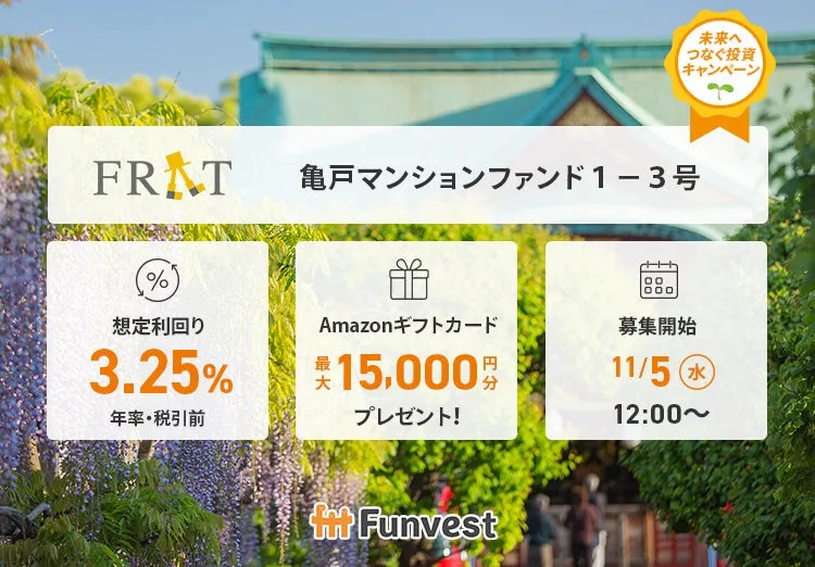 また、「FRAT 亀戸マンションファンド」に出資された投資家の皆様には、出資額に応じて最大15,000円分のAmazonギフトカードがもらえるキャンペーンが実施されます。これは出資を通じて得られるメリットのひとつで、投資をさらに楽しくさせる要素です。詳細は