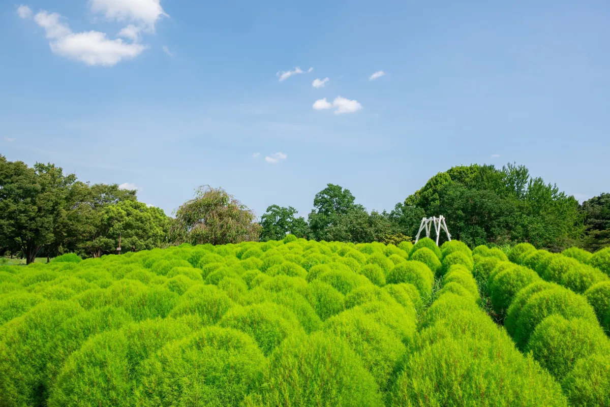 東京都立川市と昭島市に位置する国営昭和記念公園で、緑色に輝くふわふわのコキアが現在見頃を迎えています。この可愛らしい植物は「ハーブの丘」でご覧いただけます。特に盛夏の時期に見るコキアは、生命力に満ちた鮮やかな緑を放ち、訪れる人々を魅了します。