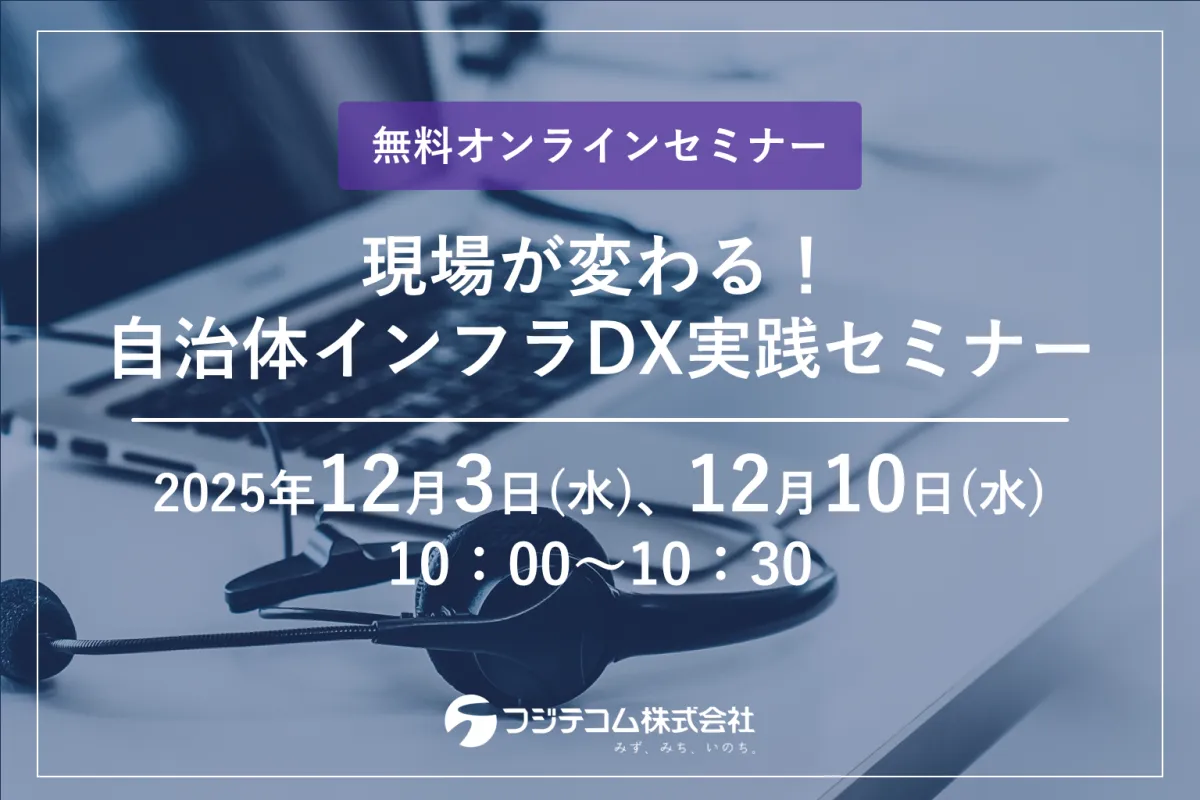 東京都千代田区に拠点を置くフジテコム株式会社が、2025年12月3日と12月10日に無料オンラインセミナー「現場が変わる!自治体インフラDX実践セミナー」を開催します。これまで数多くの事業体を支援してきた同社が、自治体インフラのデジタルトランスフォーメーション(DX)を推進するための具体的なノウハウを伝授します。