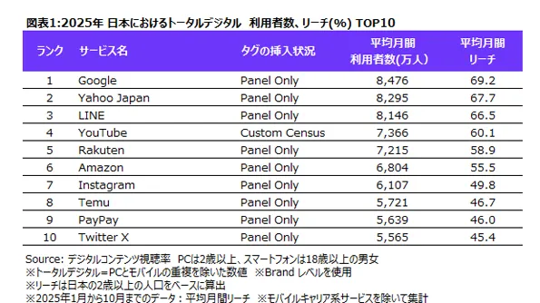 ニールセン デジタル株式会社が発表した「Tops of 2025: Digital in Japan」が、日本国内のインターネットサービス利用者数や利用時間のランクを示しています。このレポートでは、特に2024年からのトレンドがどのように発展したかに焦点をあてています。