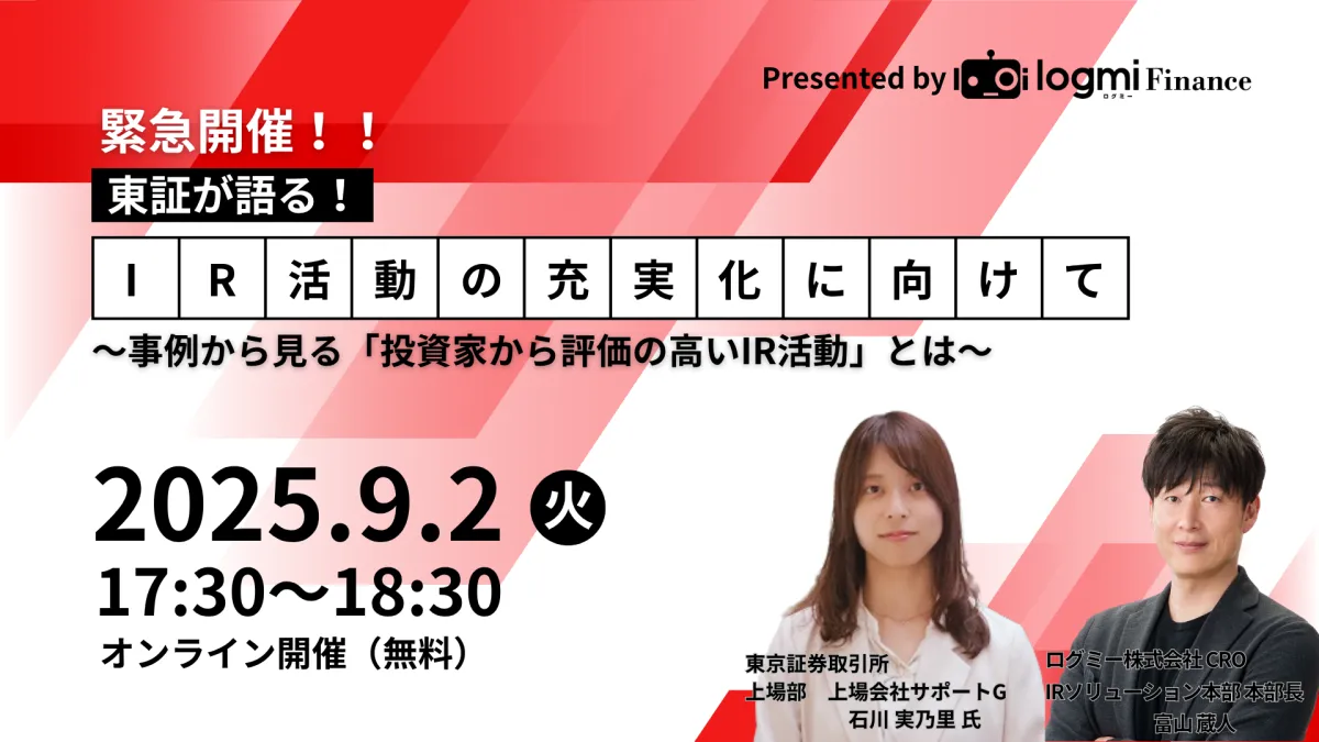 この流れの中、ログミー株式会社は、投資家への理解促進と信頼関係構築を目的としたウェビナーを9月2日(火)に開催します。アーカイブに残るオンライン形式で行われるこのイベントでは、東京証券取引所の上場会社サポートグループに所属する石川実乃里氏が登壇し、IR活動の充実化に向けた具体的な事例を紹介します。