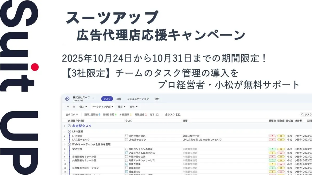 2025年10月24日から10月31日の期間中、株式会社スーツでは3社限定でスーツアップの月額利用料が3ヶ月間無料になる広告代理店応援キャンペーンを開催しています。この機会に、ぜひスーツアップを試してみてください。応募は簡単で、指定のフォームに「広告代理店応援キャンペーン」と記載するだけでOK。キャンペーンの詳細は公式ウェブサイトで確認できます。