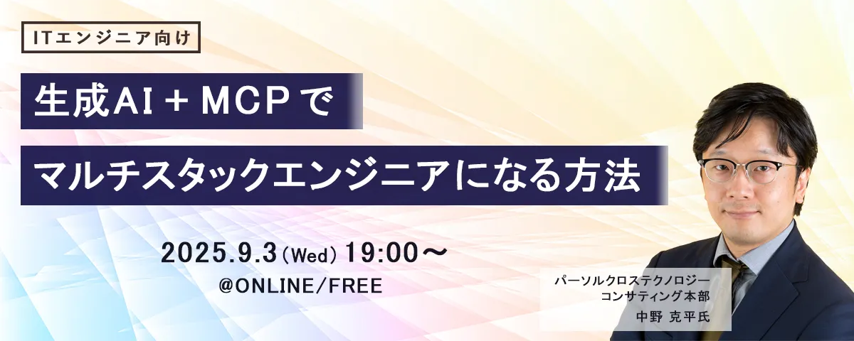 2025年9月3日、ITエンジニアを対象としたウェビナーが開催されます。株式会社PE-BANKが主催するこのオンラインセミナーのタイトルは『生成AI+MCPでマルチスタックエンジニアになる方法』です。このウェビナーは、ITエンジニアの新しいキャリア形成に必要な知識やスキルを提供することを目的としています。