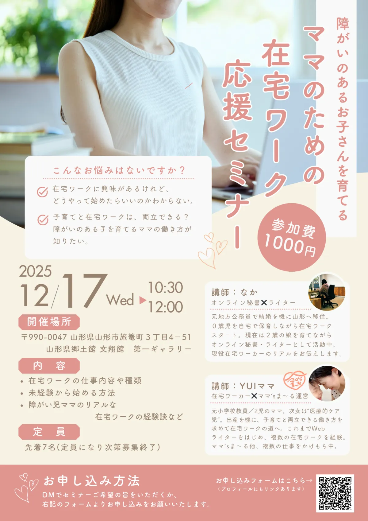 2025年12月17日(水)、山形県山形市の山形県郷土館 文翔館にて、「障がいのあるお子さんを育てるママのための在宅ワーク応援セミナー」が開催されました。このセミナーは、コミュニティ「ママ’S ま~る」に所属するYUIママが主催し、在宅ワーカーのなかさんとの共同企画として実施されました。