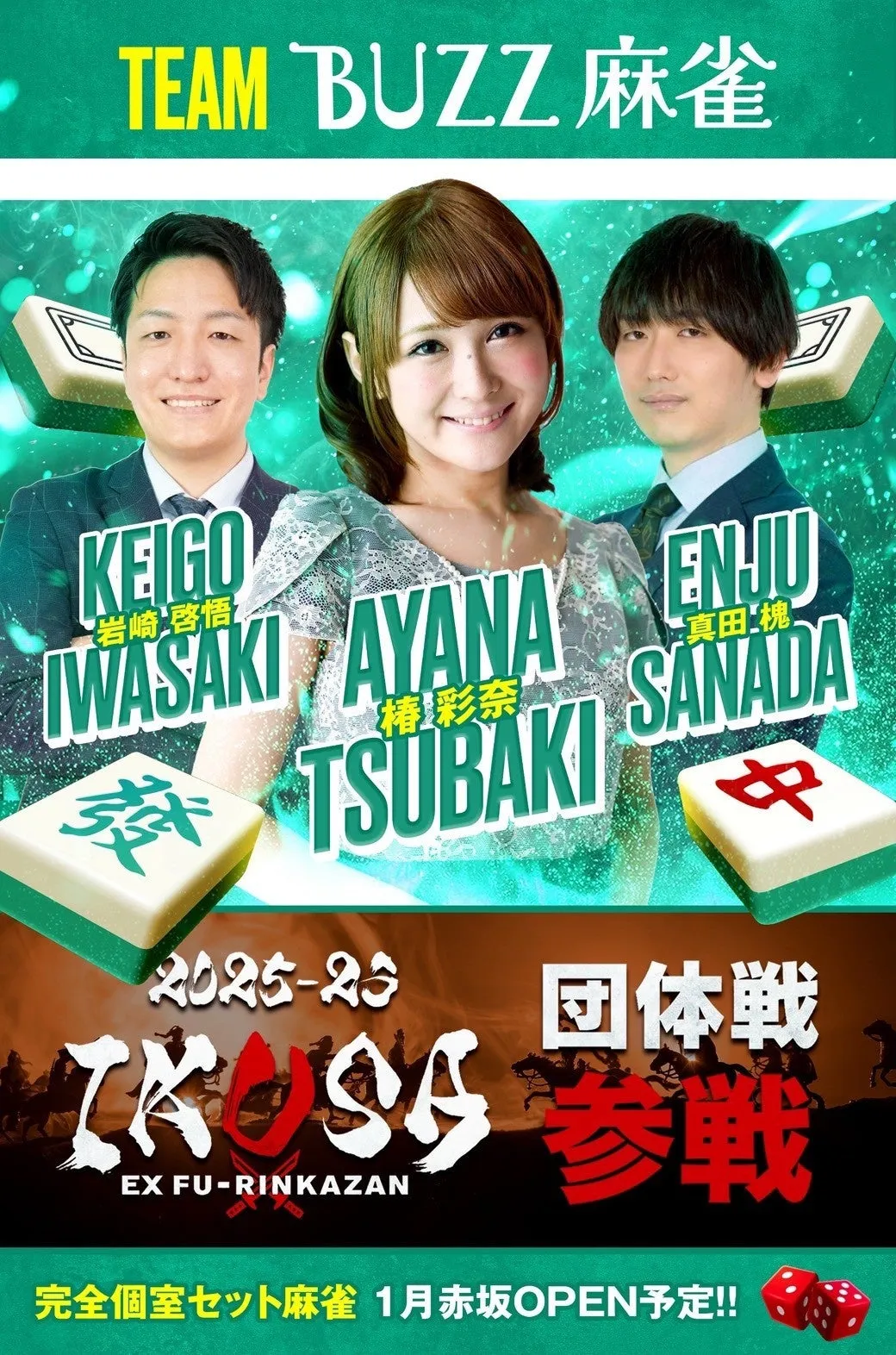 現在「BUZZ麻雀」は、テレビ朝日主催の「EX風林火山 IKUSA団体戦」にチームとして参加中です。特に注目すべきは、日本プロ麻雀協会のプロ選手たちです。チームには、椿彩奈、真田槐、岩崎啓悟の3人が名を連ねています。