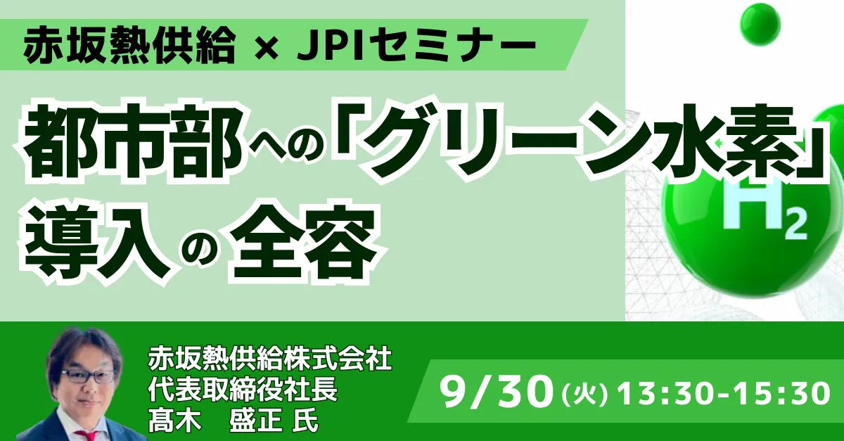 日本計画研究所(JPI)が主催するセミナーが、2025年の9月30日(火)に開催されます。特別講師として赤坂熱供給株式会社の代表取締役社長、髙木盛正氏をお迎えし、都市部へのグリーン水素の導入に関する詳しい内容をお送りいたします。このセミナーでは、次世代型の脱炭素エネルギー供給に向けた取り組みや、技術的な課題についてお話しいただきます。