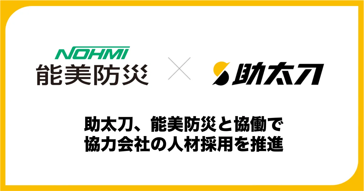 株式会社助太刀(新宿区)が、国内最大手の総合防災企業である能美防災株式会社(千代田区)と連携し、建設業界における人材採用の促進に取り組むことが発表されました。この取り組みは、建設業界の慢性的な人手不足に対応し、能美防災の協力会社における人材確保をサポートするものです。