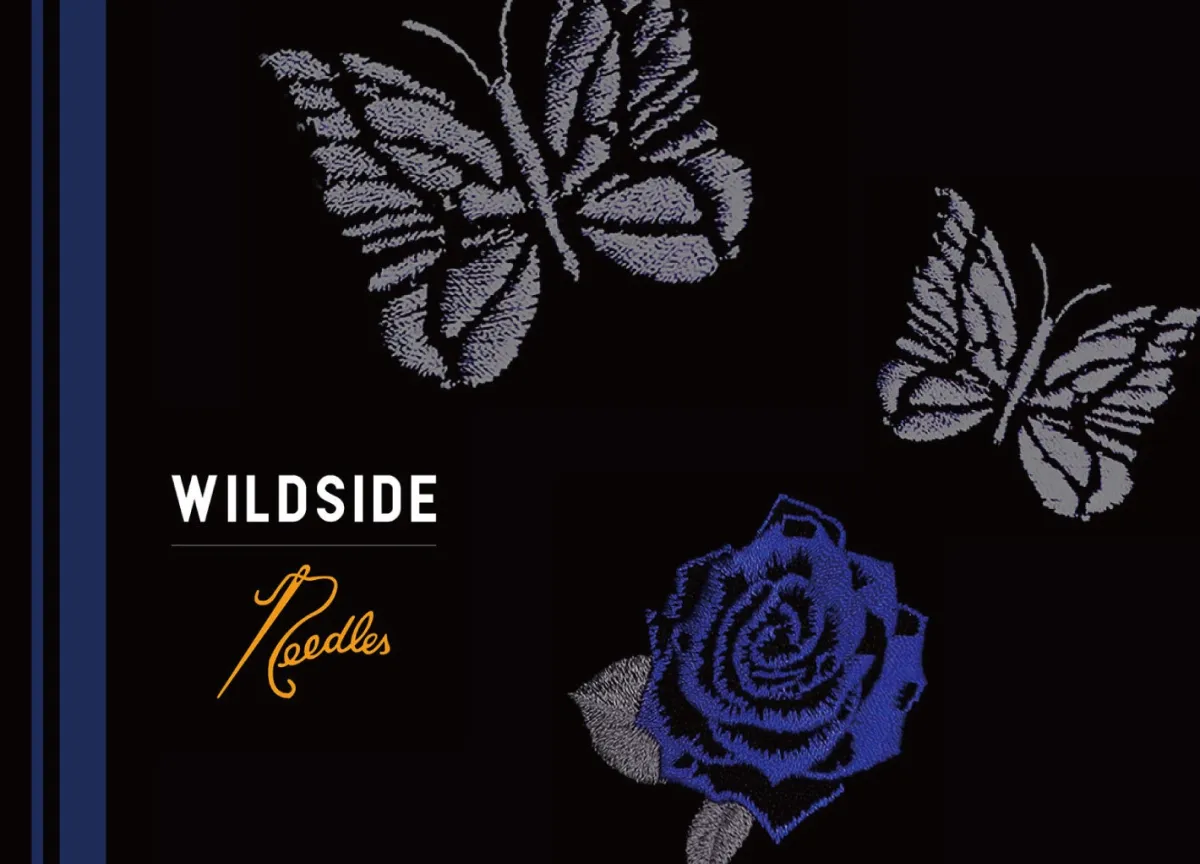 今回のコラボレーションでは、WILDSIDEを象徴する薔薇のモチーフと、NEEDLESのアイコンである蝶が見事に組み合わさったデザインが特徴です。薔薇の周りを優雅に舞う2匹の蝶を刺繍に落とし込み、ビビッドなブルーをアクセントに使用することで、個性的でありながらも洗練された印象を与えています。
