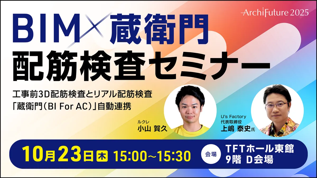 2025年の10月23日(木)、東京都内のTFTホール東館で開催される展示会「Archi Future 2025」テクニカルフォーラムにおいて、株式会社ルクレと株式会社U’s Factoryが共同で「BIM×蔵衛門による配筋検査の自動化」に関するセミナーを実施します。このセミナーでは、現場のDX(デジタルトランスフォーメーション)の推進に向けた最新の技術連携と具体的な活用事例が紹介される予定です。