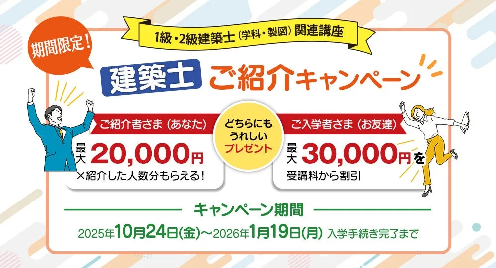建築士として自分の資格を取得するための大きなチャンスとなる「建築士 ご紹介キャンペーン」。友人や知人を紹介することで、双方にとって嬉しい特典が手に入ります。この機会にぜひ、ご参加ください!