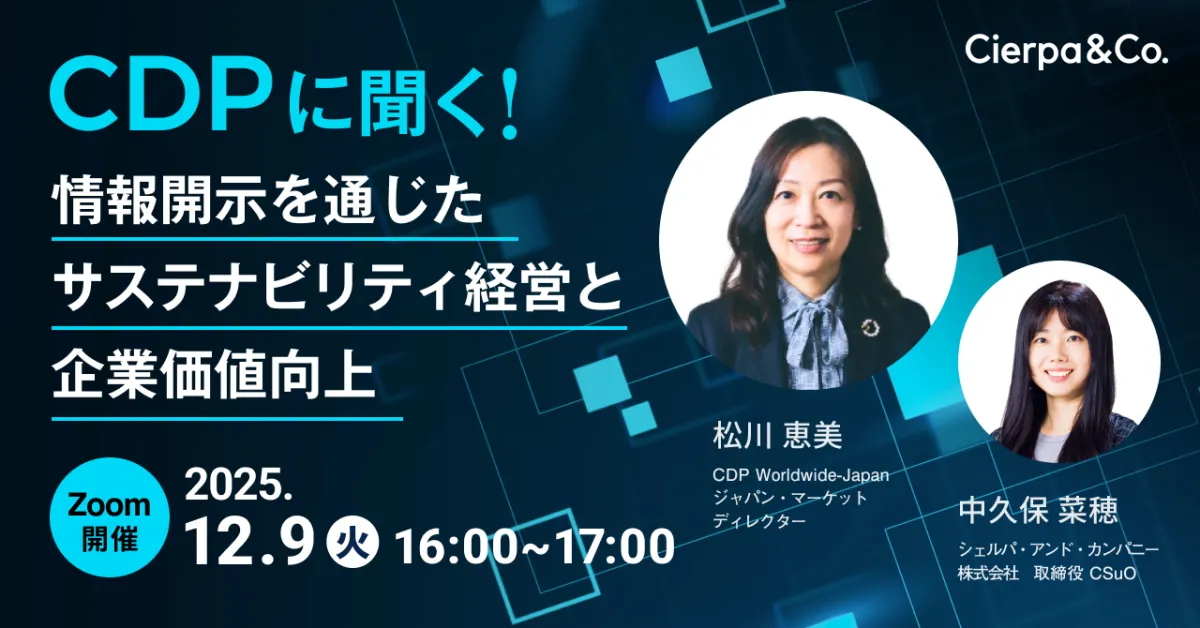 シェルパ・アンド・カンパニー株式会社は、2025年12月9日(火)に「CDPに聞く!情報開示を通じたサステナビリティ経営と企業価値向上」というテーマのウェビナーを開催します。このウェビナーは、一般社団法人CDP Worldwide-Japanから、ジャパンマーケットディレクターの松川恵美氏をお招きして、近年のCDPの動向や企業に求められるサステナビリティ情報開示についてのポイントを解説します。
