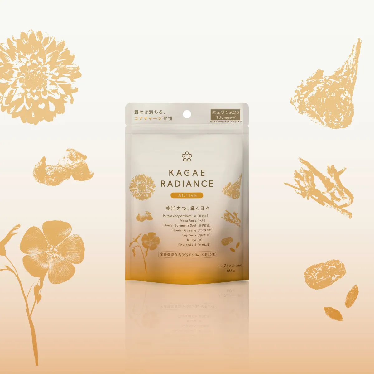 「カガエ ラディアンス アクティブ」は、合計7種類の和漢植物素材として、マカや紫菊花、ナルコユリ、エゾウコギ、クコの実、ナツメ、そして亜麻仁を配合し、日々のコンディションを整え自信に満ちた毎日を支援します。特に注目したいのは、エネルギー生成に関わる補酵素であるコエンザイムQ10や、内側からの美容ケアに貢献するアスタキサンチン、コラーゲンの構成成分であるN-アセチルグルコサミンなど、美容に特化した成分がふんだんに含まれている点です。