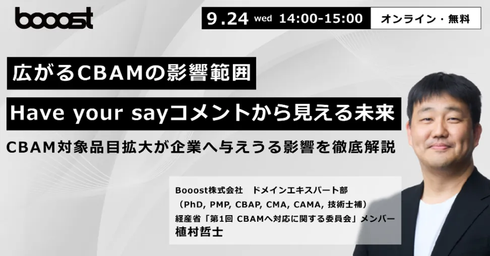 Booostは「CBAM対象製品はどこまで拡大するのか?」というテーマでオンラインセミナーを開催します。このセミナーでは、最新のEU規制動向を知り、実務担当者や経営者が直面する課題に対する戦略的対応のヒントを得ることができます。関心のある方はぜひご参加ください。