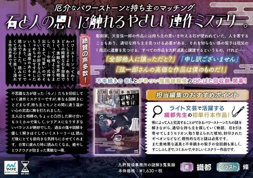 2026年3月16日、株式会社マイナビ出版から新たなライト文芸作品、『九軒探偵事務所の謎解き蒐集録』が発売されます。本書は、彫刻家の作品と、彼の孫であるOL・梨子の不思議な冒険を描いた作品です。物語は、喋る彫刻作品『枝狼』と、がめつい陰陽師探偵・九軒遥真とのドタバタ劇から始まります。