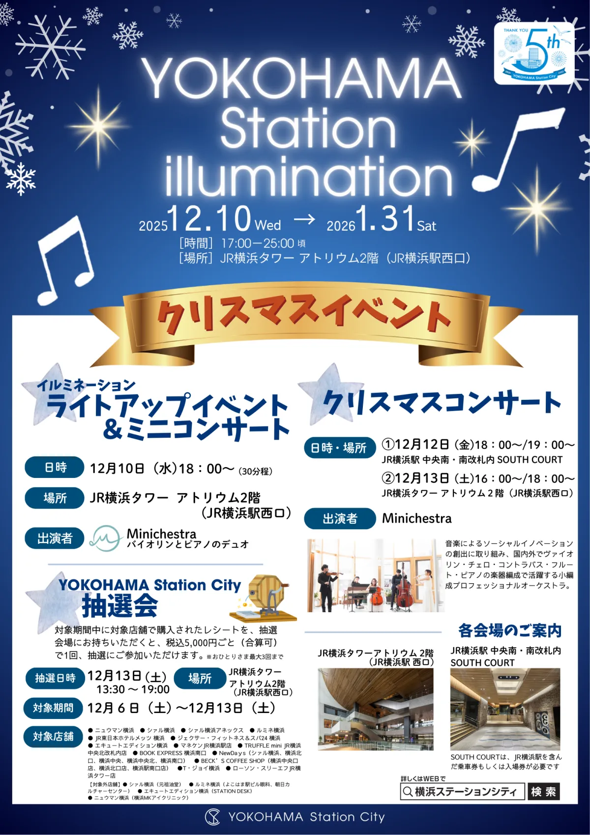 13日には、再びJR横浜タワー アトリウムで、特別な生演奏が行われます。ミニケストラの心温まるクリスマスの名曲が、横浜駅にロマンティックな雰囲気を漂わせます。