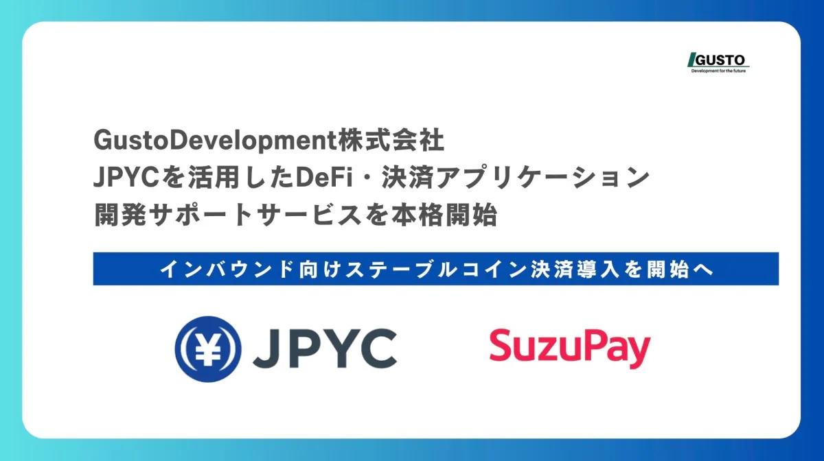 GustoDevelopment株式会社は、日本円に連動するステーブルコイン「JPYC」を活用した分散型金融(DeFi)のアプリケーション及び決済アプリケーションの開発支援を本格スタートすることを発表しました。この新サービスは、従来のWebサービスやECサイトへのステーブルコイン決済導入の支援に加え、JPYCを基盤とした独自のサービスの構築までを含むワンストップサポートを提供します。