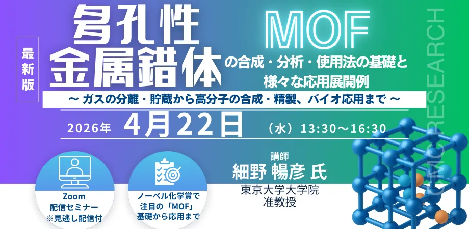 次世代材料である多孔性金属錯体(MOF)の魅力に迫るセミナーが、2026年4月22日(水)にZoomを通じて開催されます。このセミナーは、東京大学大学院の細野暢彦准教授を講師に迎え、MOFの合成、分析、および幅広い応用例について深く学べる貴重な機会です。特に、ガスの分離や貯蔵、高分子の合成・精製、バイオへの応用など、実際に役立つ技術が紹介されます。