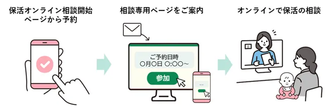 保護者は、自治体が設定した相談可能日時から希望日時を選び、いつでもWebから予約が可能です。自宅や職場など、どこからでもアクセスできるため、育児や仕事の合間にも利用しやすくなっています。