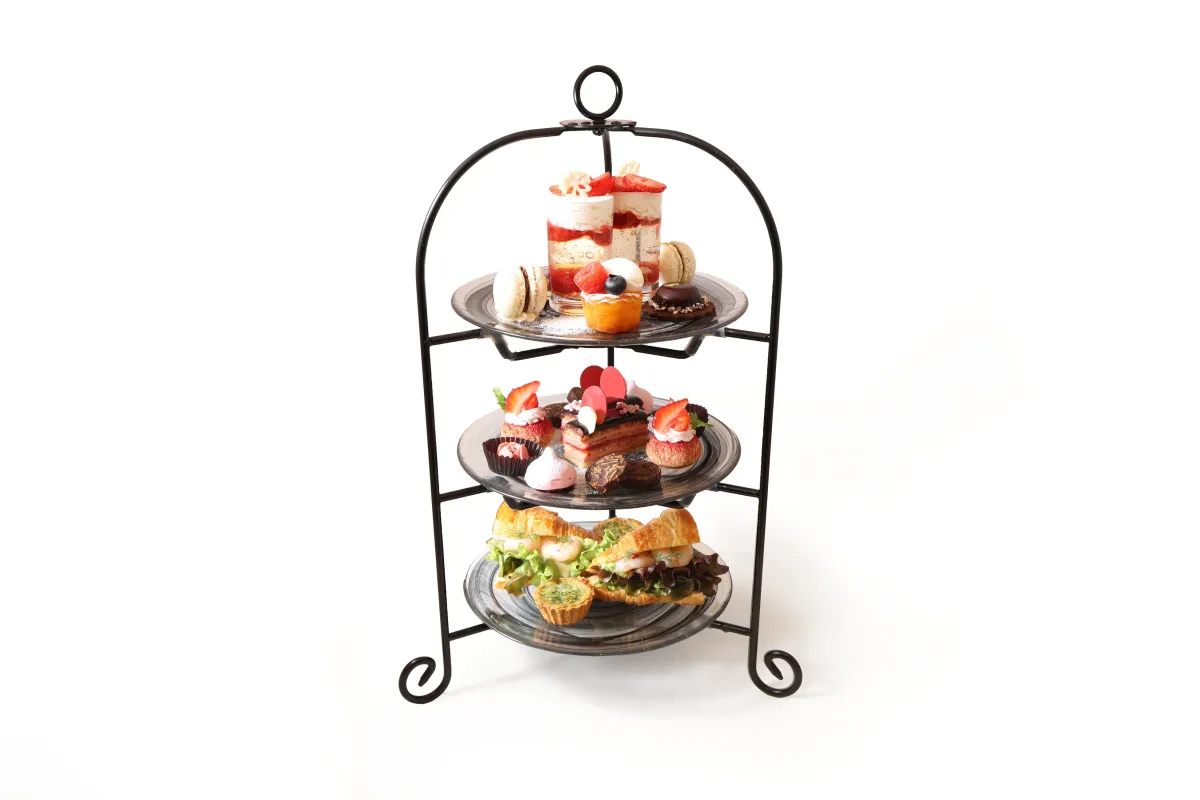 中段にはフランボワーズのギモーヴ、いちごのオペラ、アーモンドの香ばしいクッキー、ボンボンショコラ、繊細なクッキーシューが揃い、下段には濃厚なセイボリーとしてエビとアボカドのクロワッサンサンドとミニキッシュを用意しています。