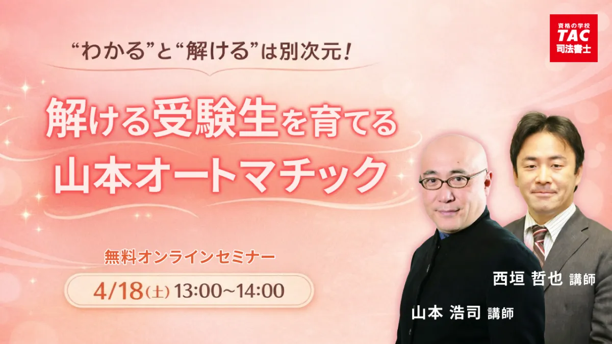 司法書士試験の合格を目指す方々へ、TAC司法書士講座が主催するオンラインセミナーのご案内です。このセミナーは、今年の4月18日(土)13:00からZoomを利用して開催されます。特に、これから学習を始める方や受験を検討している方々にぴったりの内容となっています。