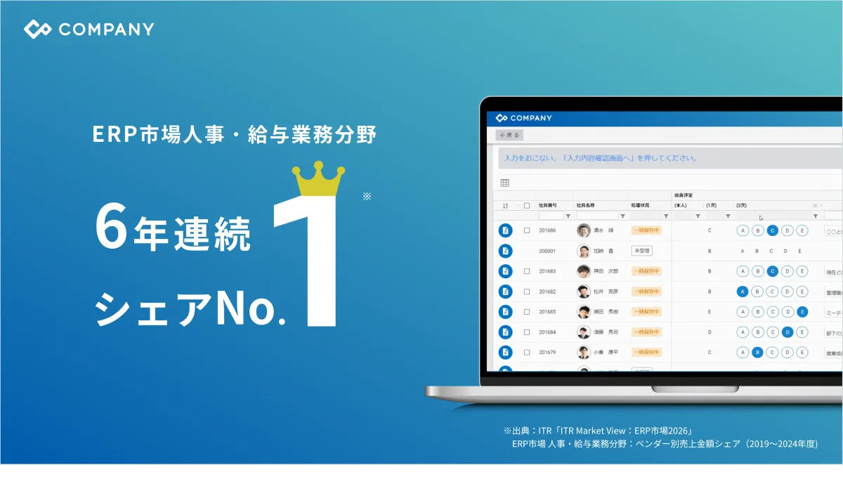 市場調査会社のアイ・ティ・アールが発行した「ITR Market View:ERP市場2026」によれば、コンプライアンス遵守や業務効率化が求められる現代において「COMPANY」の需要はますます高まっています。また、同報告書では人事管理、給与管理、さらには就業管理に至るまで幅広い業務分野で絶えずシェアを伸ばしていることも強調されています。