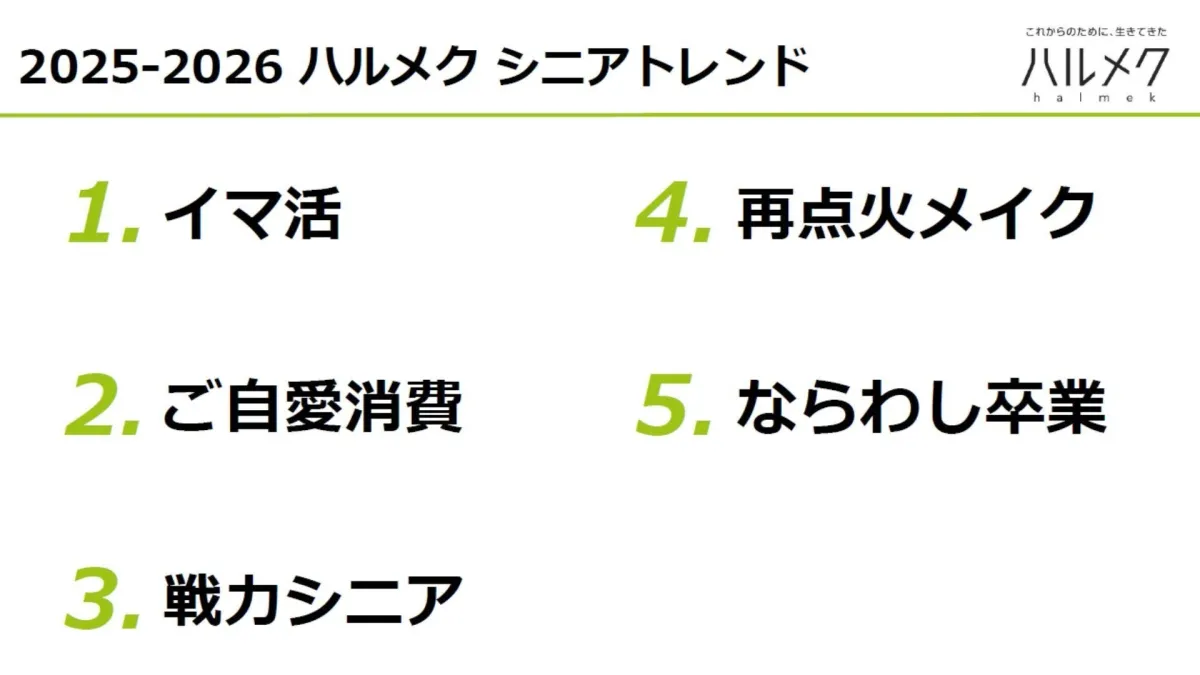 2025-2026年に向けてのシニアトレンドが発表され、注目を集めています。このトレンドは、シニア世代が自己投資や本当に楽しめる体験に積極的になっていることを示しています。特に「イマ活」と呼ばれる、今を楽しむ姿勢は、特に目を引くものがあります。