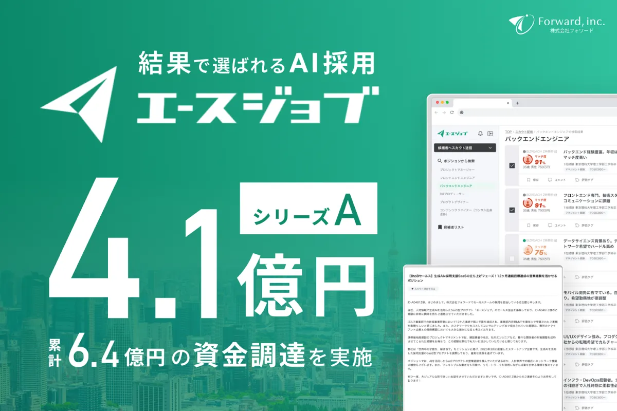 株式会社フォワード(本社・東京都新宿区、代表取締役・名古屋考平)が運営するAI採用プラットフォーム「エースジョブ」が、シリーズAラウンドで4.1億円の資金調達を成功させました。今回の資金調達によって、フォワードの累計調達額は6.4億円に達し、顧客成果の再現性を高めるためのさらなる投資へと進んでいきます。