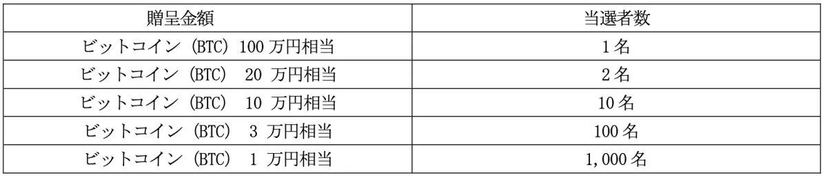 この株主優待の対象となるのは、2026年2月28日現在、同社株式を3,000株(30単元)以上保有している株主さんです。対象となる株主の中から、抽選で総額15.4百万円相当のビットコインが贈呈されるとのことです。