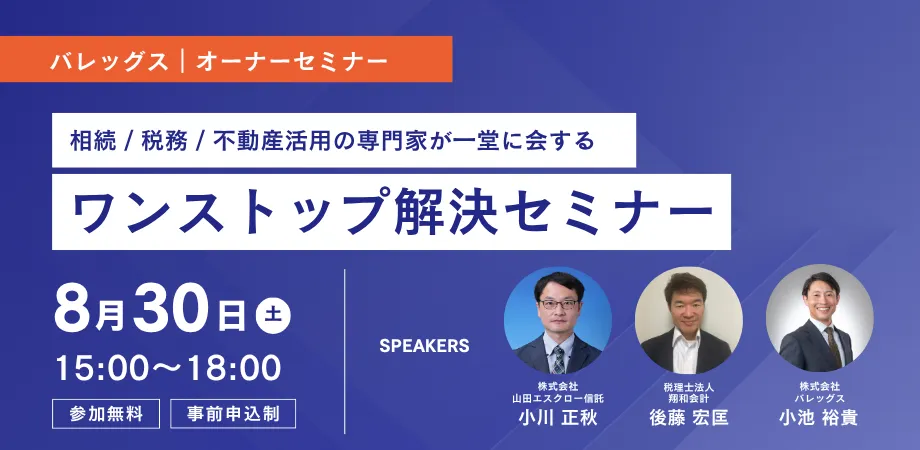 株式会社バレッグスでは、不動産オーナー様を対象に「ワンストップ解決セミナー」を2025年8月30日(土)に開催します。このセミナーでは、相続、税務、そして不動産活用についての専門家が一堂に会し、オーナー様が直面する資産に関する様々な問題に対して、一括した解決策を提案します。